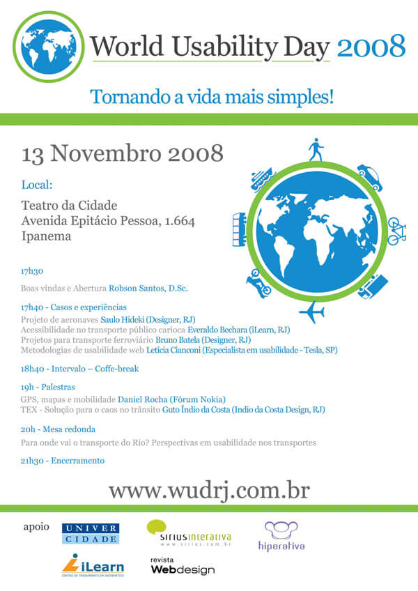 Uma embalagem que não abre direito ou um produto difícil de usar. Quem já não passou por um problema desses? Com o objetivo de despertar a atenção das empresas e dos consumidores para essas questões foi criado o Dia Mundial da Usabilidade. Este ano o tema do evento, que é realizado em várias cidades do planeta no mesmo dia 13 de novembro, é "Transportes". O Rio de Janeiro mais uma vez comemora a data com uma noite repleta de palestras sobre o assunto com especialistas de design e usabilidade.